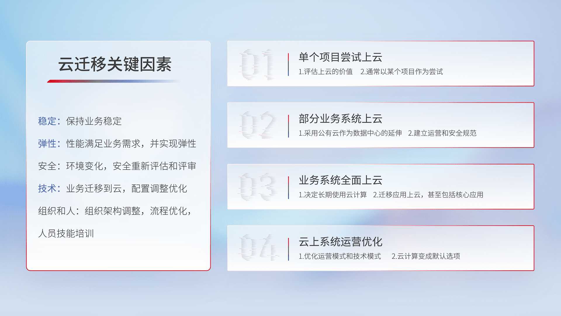 结合实际业务,,,,从规划设计、、、云平台选型、、、云原生改造、、数据迁移、、、集成交付,,迁移全过程为客户识别最佳上云路径,,做好风险识别管理,,设计网络架构、、、、身份权限、、、、安全审计合规、、、操作审计、、日志审计、、监控告警策略、、多站点容灾设计等,,,,对云上基础设施进行整体规划,,提升IT治理水平,,,,以满足弹性、、高可用、、、、高性能的需求。。。